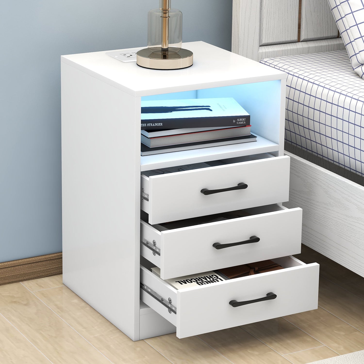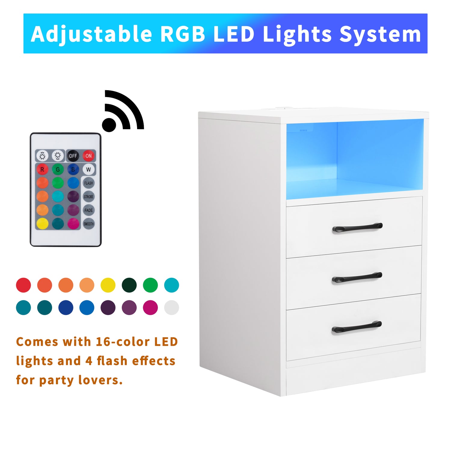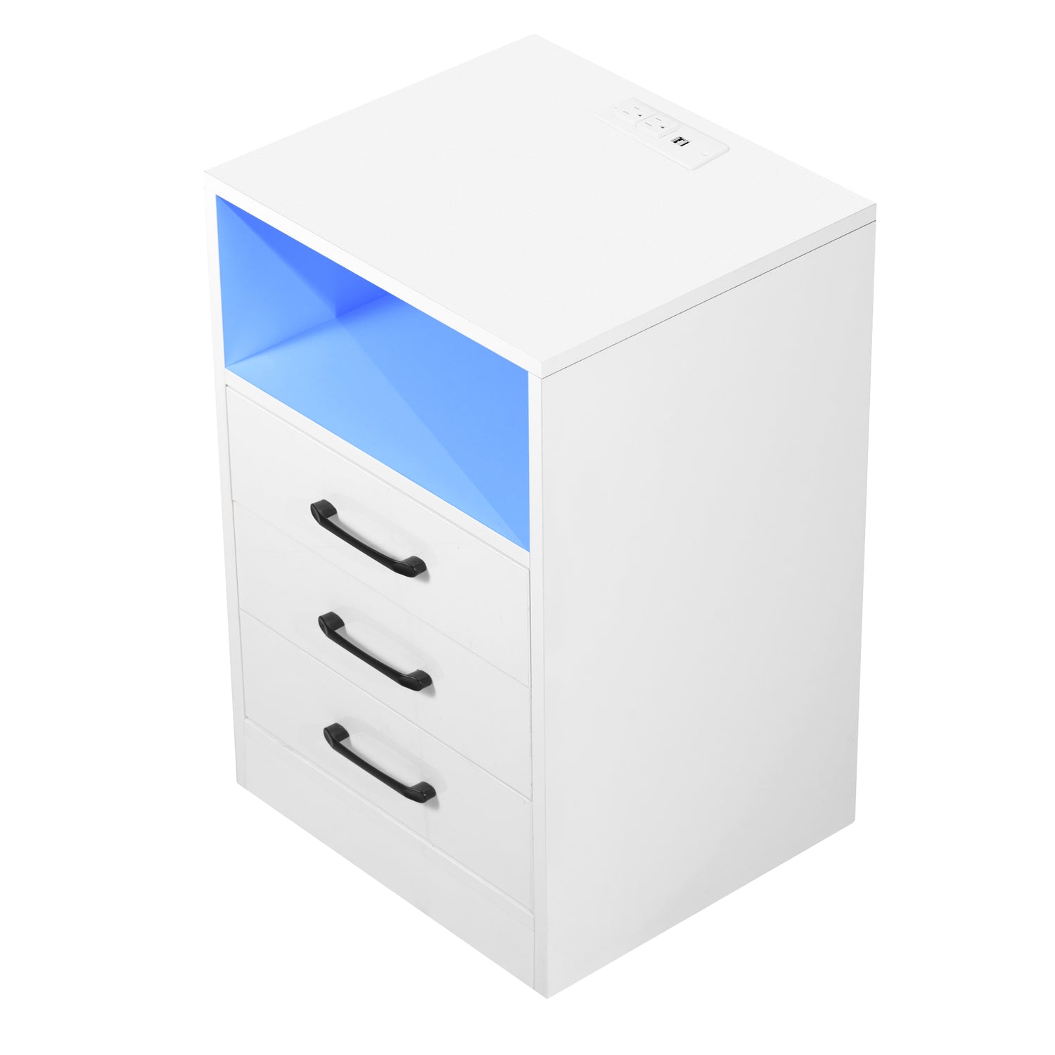 BTMWAY LED NIGHTSTAND WITH 3 DRAWERS, 1 WIRELESS CHARGING STATION, 2 CHARGE STATION, 2 PORTS, 16 COLOR LED Lights