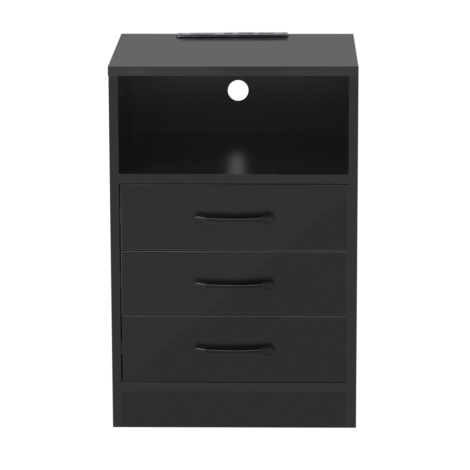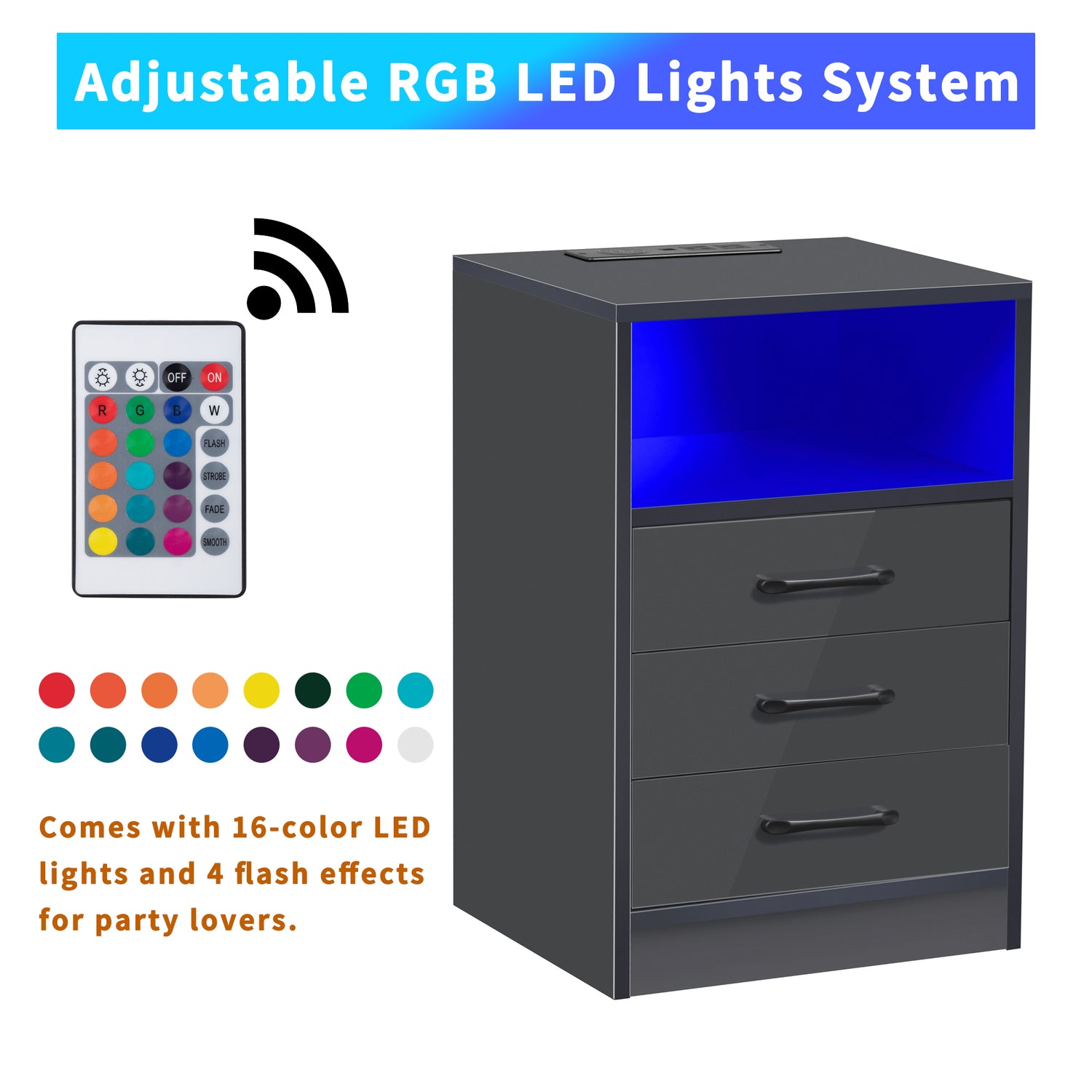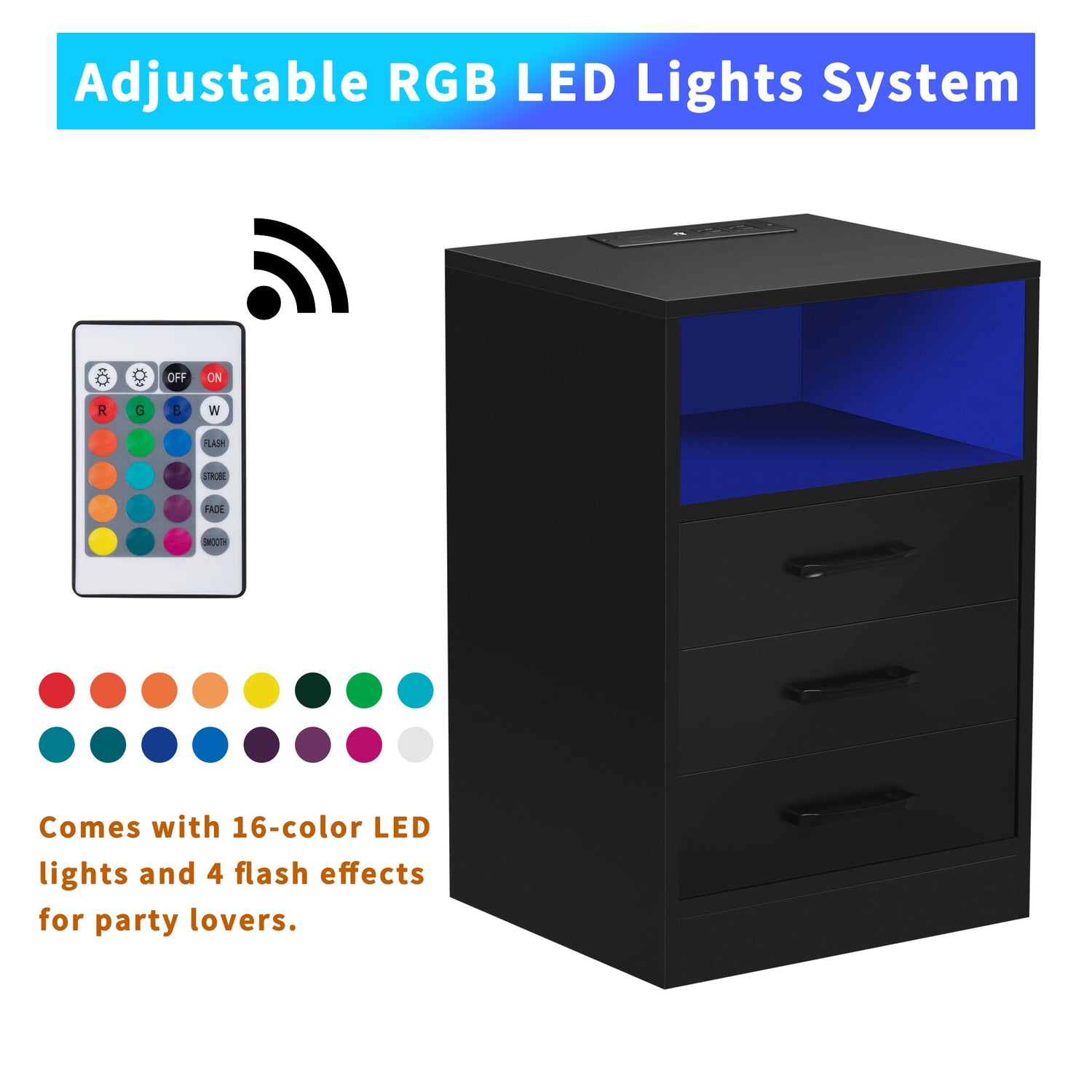 3 Drawer Nightstand with Charging Station, BTMWAY Modern Black Nightstand LED Light Bedside Table, Wood Bedroom Nightstand for Bedroom, Living Room, Remote Control 16 Multi-color LED Lights
