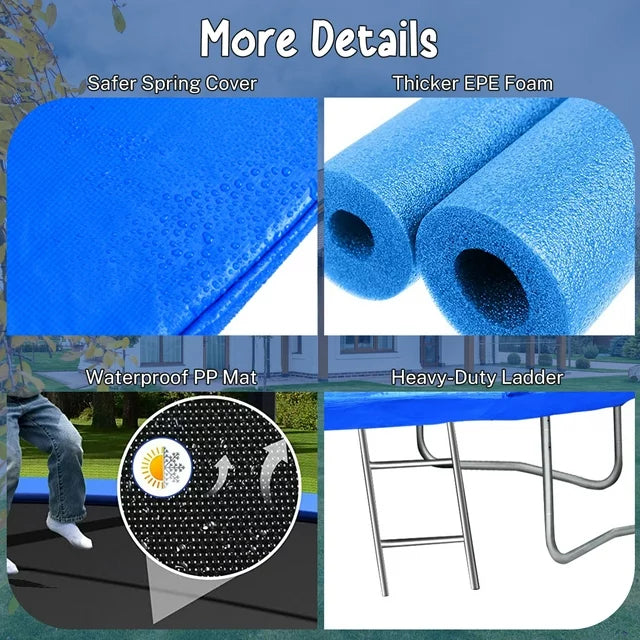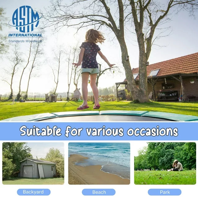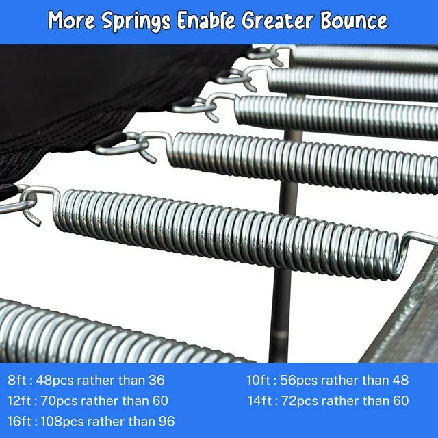 【 Perfect Bouncing Experience】The trampoline's high-weight capacity is wrapped with 70 hot-dips galvanized springs, and all spring has undergone 20,000 extreme extension experiments without deformation. 70 high-tension steel springs(8FT 48pcs/10FT 56pcs/12FT 70pcs/14FT 72pcs/16FT 108pcs)provide a very strong elasticity for the exercise trampoline, when children play in our kid trampoline, they can jump higher