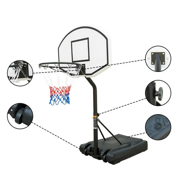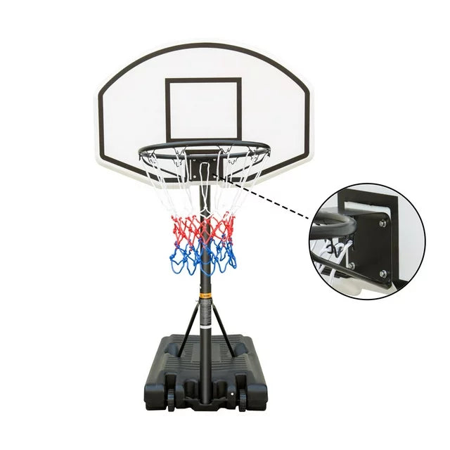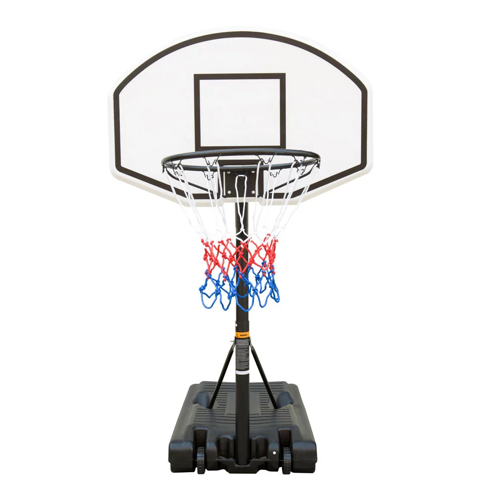Equipped with two wheels and a weighted base, this portable basketball hoop easily moves from place to place, making it perfect for summertime fun and poolside entertainment.